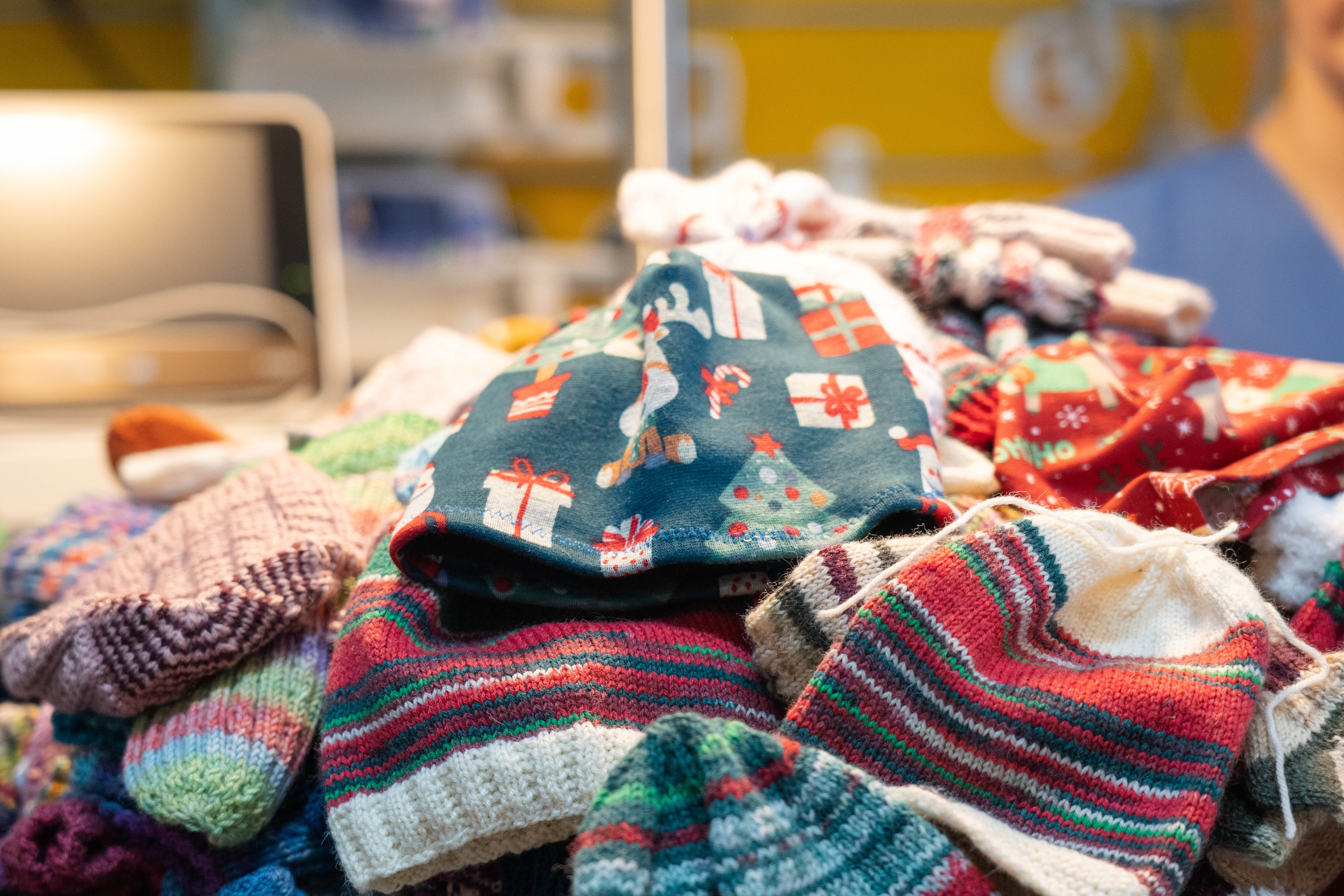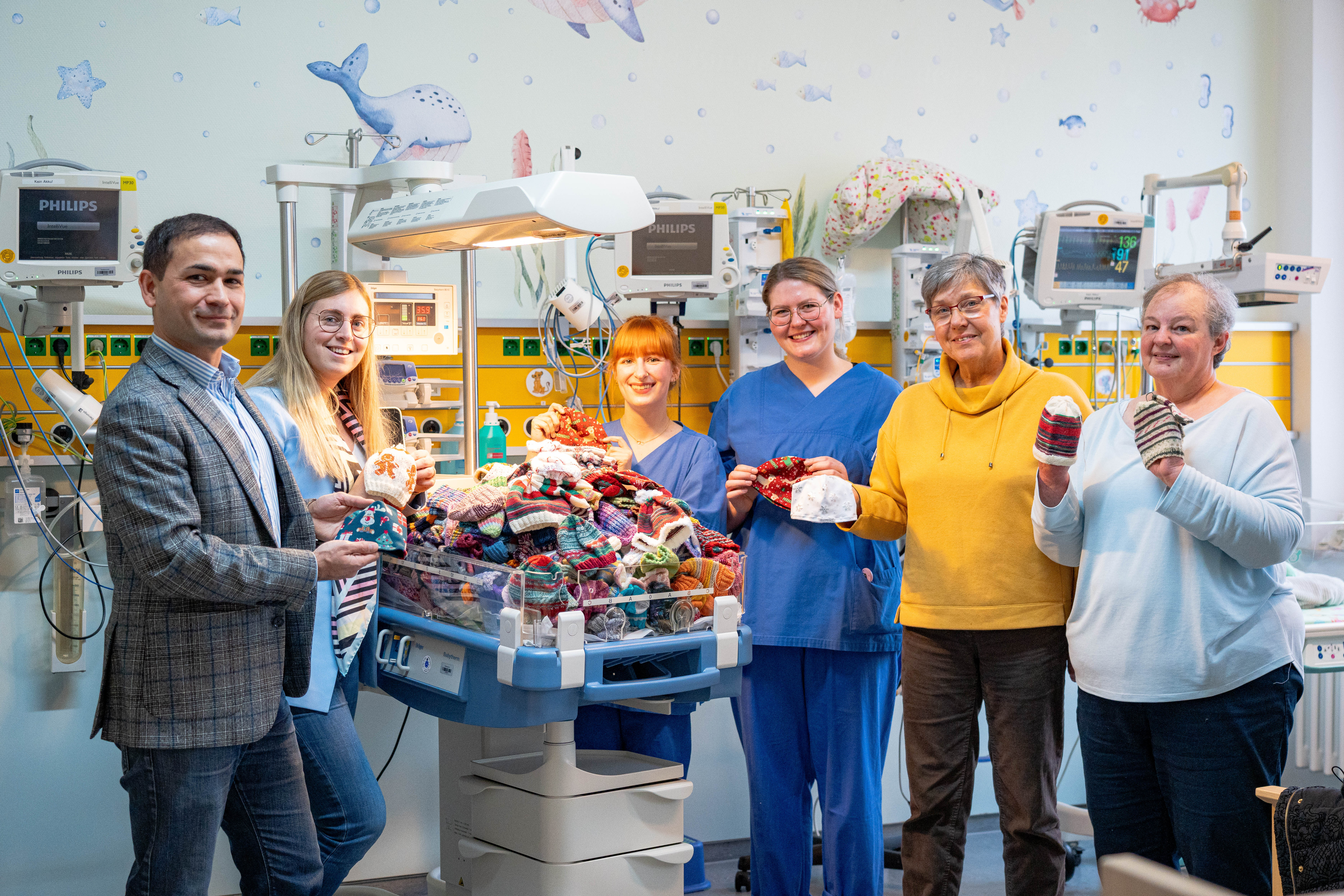 Zahlreiche handgestrickte Mützen, Beanies und Socken überreichten Ulrike Heetlage und Heike Grote an die Neonatologie des St.-Antonius-Hospitals in Kleve, ein sichtbares Zeichen von zwölf Jahren ehrenamtlicher Arbeit. In dieser Zeit hat die Strickgruppe rund 5.000 Kleidungsstücke gefertigt, jedes einzelne mit viel Herzblut. Für eine Mütze benötigen die Strickerinnen im Schnitt anderthalb Stunden. „Bei einem spannenden Film geht es manchmal sogar noch schneller“, lacht Ulrike Heetlage.