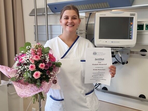 Schnelle und spezialisierte Hilfe ist bei einem Schlaganfall entscheidend. Damit unsere Patientinnen und Patienten bestmöglich versorgt werden, hat unsere Pflegefachkraft Elisabeth Westerhoff am Universitätsklinikum Essen die Weiterbildung zur Stroke Nurse abgeschlossen, einer speziell geschulten Pflegekraft für Schlaganfall-Patienten auf der Stroke Unit. Von Januar bis September 2025 besuchte Frau Westerhoff den Kurs über neun Monate hinweg im Intervall und absolvierte dabei insgesamt 240 Unterrichtsstunden.
